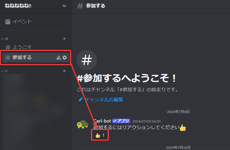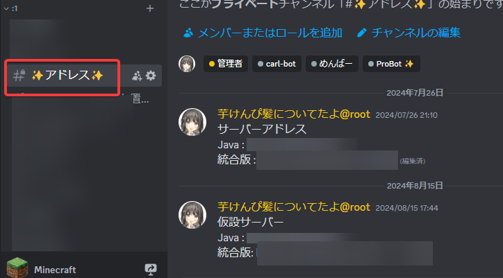 解説 参加の仕方 Discord Discordに参加したら 参加する チャンネルに移動して、そこにあるメッセージに👍をつけてください。 リアクションをつけると勝手にロールが付きます。 これでアドレスや雑談などのチャンネルに参加することができます。 Minecraft アドレスを確認 アドレス チャンネルにJava版、統合版それぞれのアドレスが載っています。 サーバーを追加(Java) これだけ。 サーバーを追加(統合版) address.example.comでは参加できないよ~ん!! 以上 以上です。